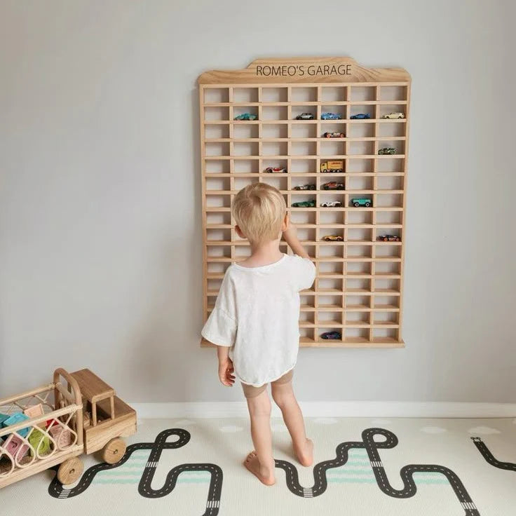 The Wooden Car Collector Garage is a wall-mounted storage shelf designed for organizing and displaying toy cars in a clean and stylish way. Made from high-quality wood, it features multiple compartments that keep each car visible, accessible, and neatly arranged. Perfect for car lovers and ideal for keeping playrooms organized while adding a modern decor touch.